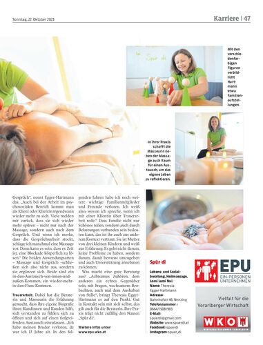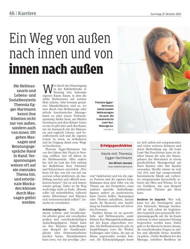 Die Heilmasseurin und Lebens- und Sozialberaterin Theresia Egger-Hartmann kennt ihre Klienten nicht nur von außen, sondern auch von innen. Oft gehen Massagen und Beratungsgespräche Hand in Hand. Verspannungen weisen oft auf ein mentales Thema hin, und emotionale Blockaden können durch Massagen gelöst werden.