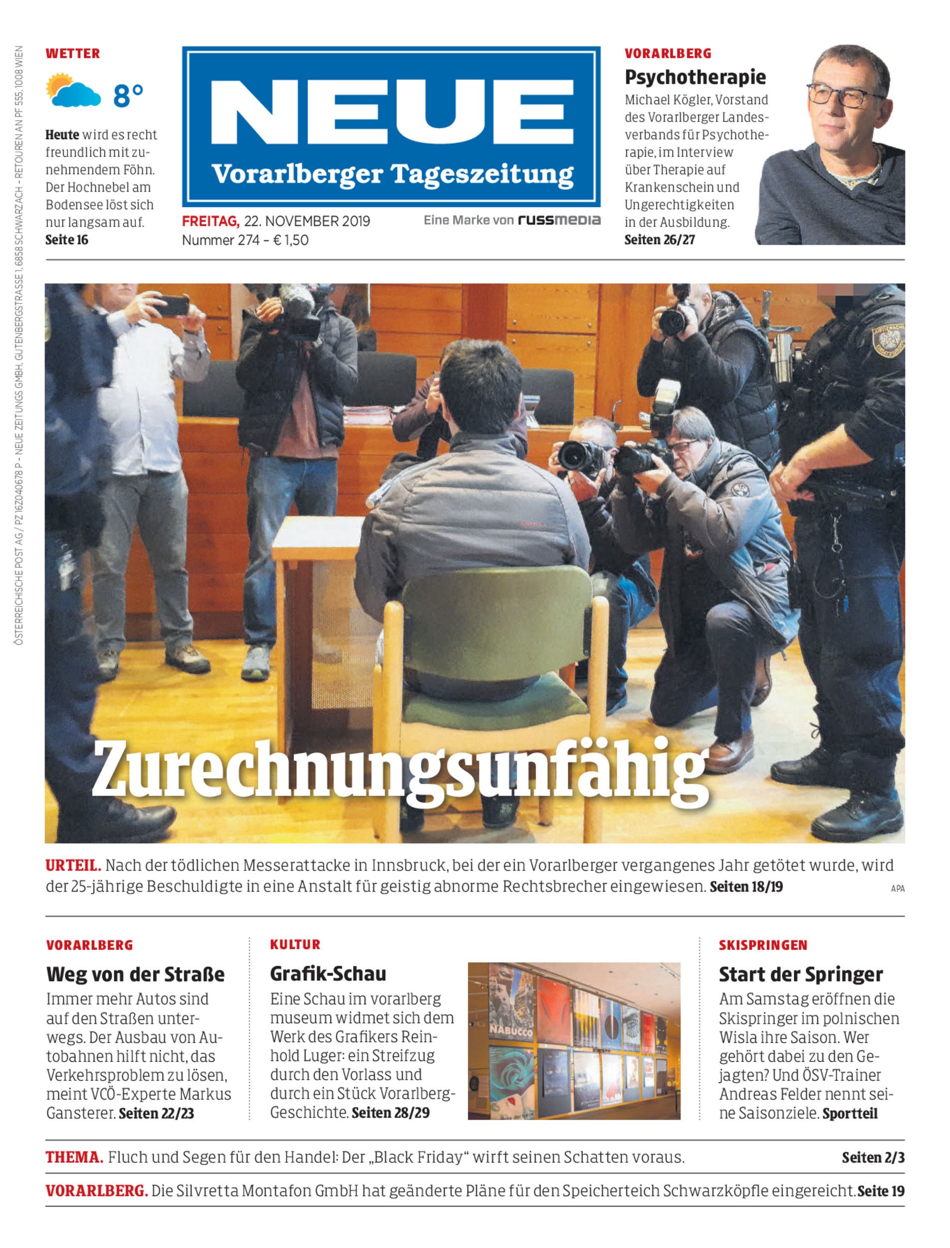 Urteil. Nach der tödlichen Messerattacke in Innsbruck, bei der ein Vorarlberger vergangenes Jahr getötet wurde, wird der 25-jährige Beschuldigte in eine Anstalt für geistig abnorme Rechtsbrecher eingewiesen. Seiten 18/19 apa