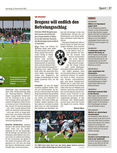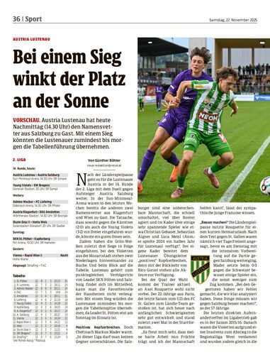 Vorschau. Austria Lustenau hat heute Nachmittag (14.30 Uhr) den Namensvetter aus Salzburg zu Gast. Mit einem Sieg könnten die Lustenauer zumindest bis morgen die Tabellenführung übernehmen.