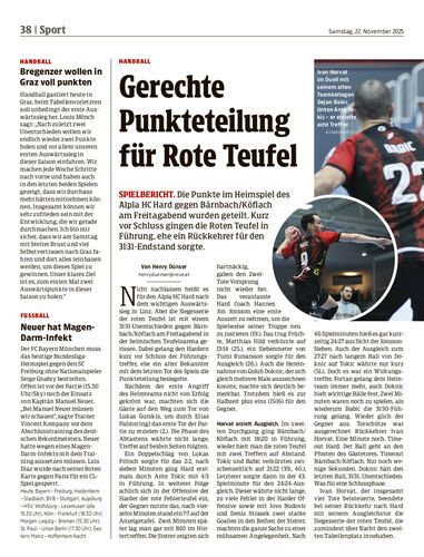 Spielbericht. Die Punkte im Heimspiel des Alpla HC Hard gegen Bärnbach/Köflach am Freitagabend wurden geteilt. Kurz vor Schluss gingen die Roten Teufel in Führung, ehe ein Rückkehrer für den 31:31-Endstand sorgte.