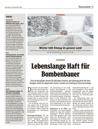 Das Urteil gegen einen 56-jährigen Steirer, der Sprengsätze bei den Zeugen Jehovas deponiert hatte, wurde am Freitag in Graz bestätigt.