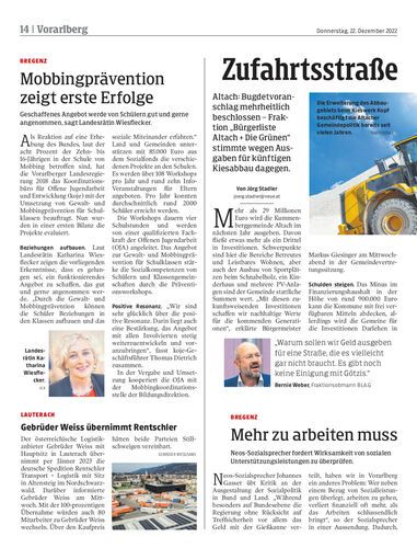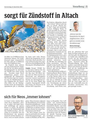 Altach: Bugdetvoranschlag mehrheitlich beschlossen – Fraktion „Bürgerliste Altach + Die Grünen“ stimmte wegen Ausgaben für künftigen Kiesabbau dagegen.
