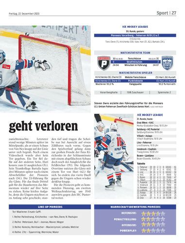 Spielbericht. Im Duell mit Tabellenführer Fehervar mussten sich die Pioneers Vorarlberg knapp geschlagen geben. Kurz vor Ende glich Kirichenko für die Heimmannschaft aus, in der Overtime ging es dann schnell.
