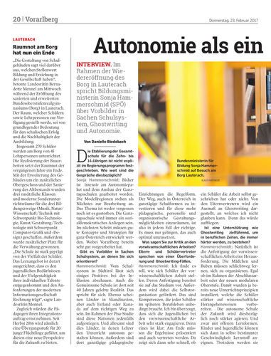 Interview. Im Rahmen der Wiedereröffnung des Borg in Lauterach spricht Bildungsministerin Sonja Hammerschmid (SPÖ) über Vorbilder in Sachen Schulsystem, Ghostwriting und Autonomie.
