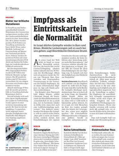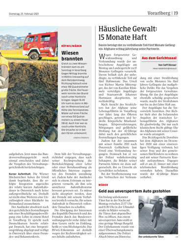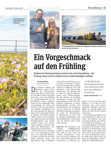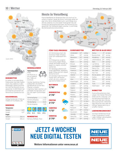 Wetter. Vor ein paar Tagen noch führte Polarluft eisige Kälte nach Vorarlberg, jetzt locken viel Sonne und milde Temperaturen nach draußen. Bis Freitag bleibt es warm, dann wird eine schwache Kaltfront erwartet. Seiten 14/15 Hartinger
