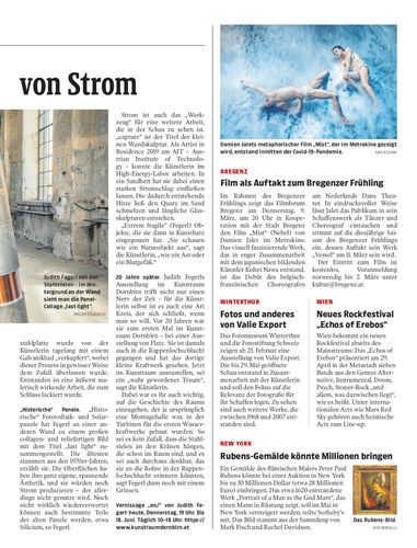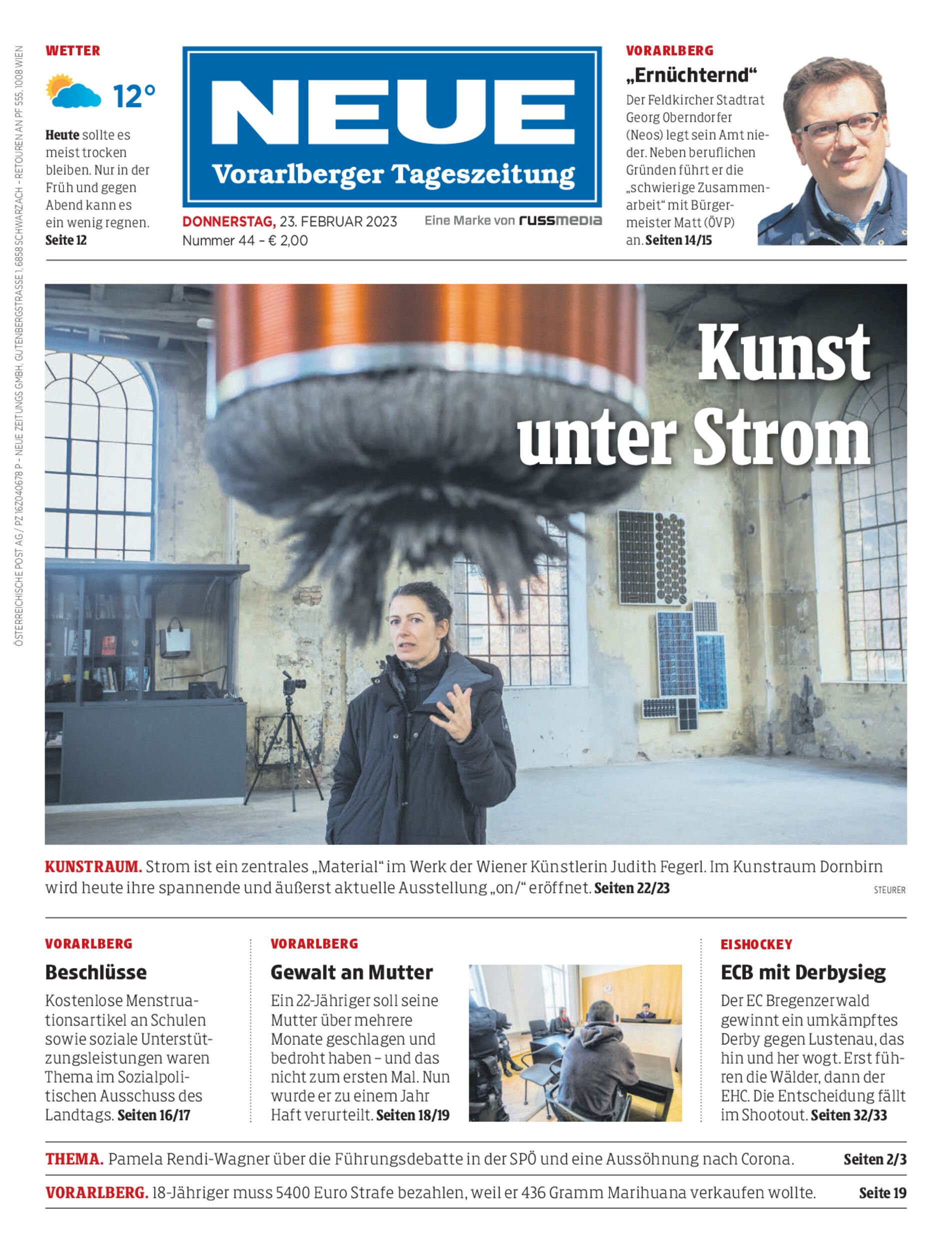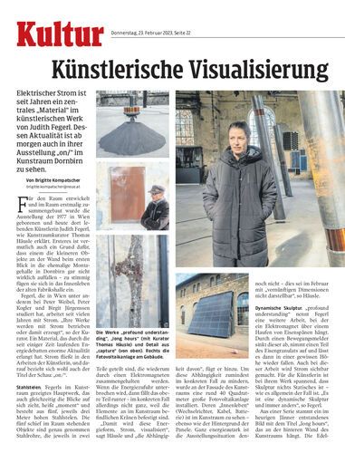 Elektrischer Strom ist seit Jahren ein zentrales „Material“ im künstlerischen Werk von Judith Fegerl. Dessen Aktualität ist ab morgen auch in ihrer Ausstellung „on/“ im Kunstraum Dornbirn zu sehen.