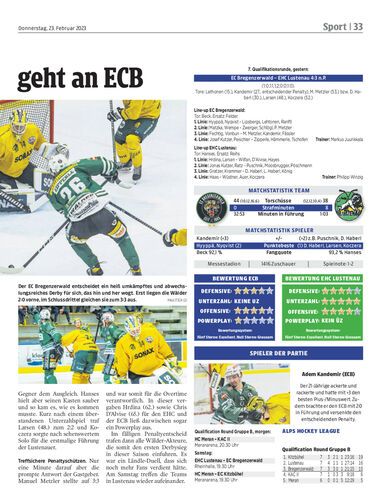 Der EC Bregenzerwald feiert mit dem 4:3 n.P. den ersten Erfolg gegen den EHC Lustenau in dieser Saison. Bereits am Samstag folgt in der Rheinhalle das Rückspiel der Quali-Gruppe B.