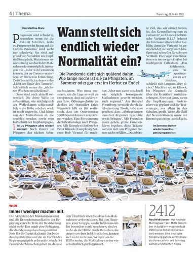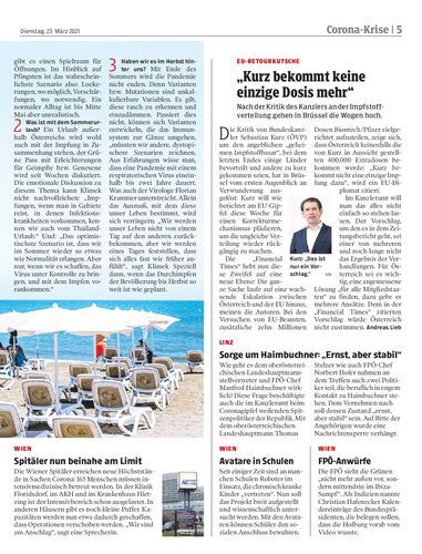 Corona-Massnahmen. Bund und Länder vertagen sich in Sachen Corona. Weder gibt es Lockerungen noch Verschärfungen. Ratschläge der Experten wie verlängerte Osterferien wurden nicht berücksichtig. Seiten 2/3 APA