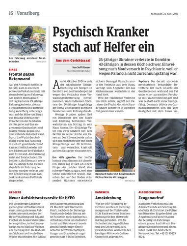 26-jähriger Ukrainer verletzte in Dornbirn 43-Jährigen in dessen Küche schwer. Einweisung nach Mordversuch in Psychiatrie, weil er wegen Paranoia nicht zurechnungsfähig war.