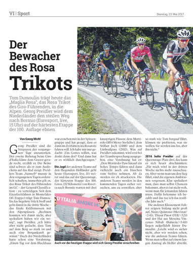 Tom Dumoulin trägt heute das „Maglia Rosa“, das Rosa Trikot des Giro-Führenden, in die Alpen. Georg Preidler wird dem Niederländer den steilen Weg nach Bormio (Eurosport, live, 15 Uhr) auf der härtesten Etappe der 100. Auflage ebnen.
