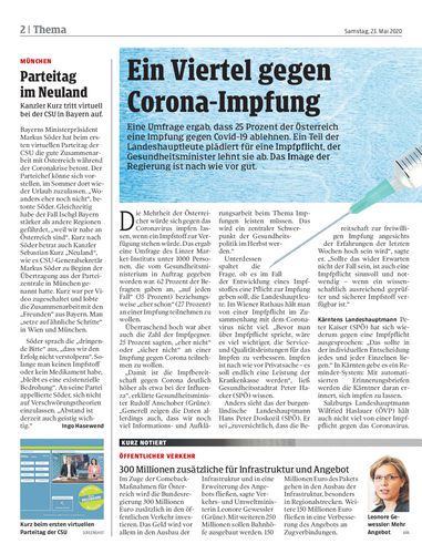 Eine Umfrage ergab, dass 25 Prozent der Österreich eine Impfung gegen Covid-19 ablehnen. Ein Teil der Landeshauptleute plädiert für eine Impfpflicht, der Gesundheitsminister lehnt sie ab. Das Image der Regierung ist nach wie vor gut.