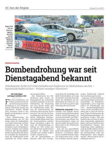 Unbekannter droht in Friedrichshafen mit Explosion im Medienhaus am See – Spürhunde finden nichts – Polizei verzögert informiert.