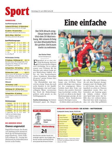 Der SCR Altach empfängt heute (18.30 Uhr) den SV Mattersburg. Mit einem Erfolg ist den Rheindörflern ihr großes Ziel kaum mehr zu nehmen.