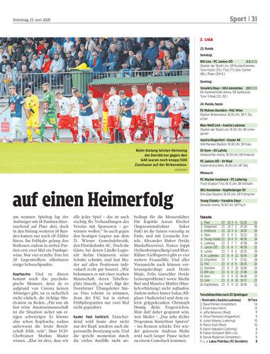 Im fünften Spiel nach der Pause empfängt der seit September 2019 auf der Birkenwiese sieglose FC Dornbirn heute (18.30 Uhr) den FAC Wien.