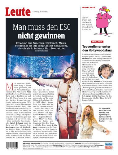 Rosa Linn aus Armenien erzielt mehr Musik- Streamings als ihre Song-Contest-Konkurrenz, obwohl sie in Turin nur Platz 20 erreichte. Von Christian Ude