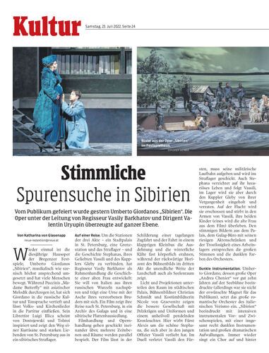 Vom Publikum gefeiert wurde gestern Umberto Giordanos „Sibirien“. Die Oper unter der Leitung von Regisseur Vasily Barkhatov und Dirigent Valentin Uryupin überzeugte auf ganzer Ebene.