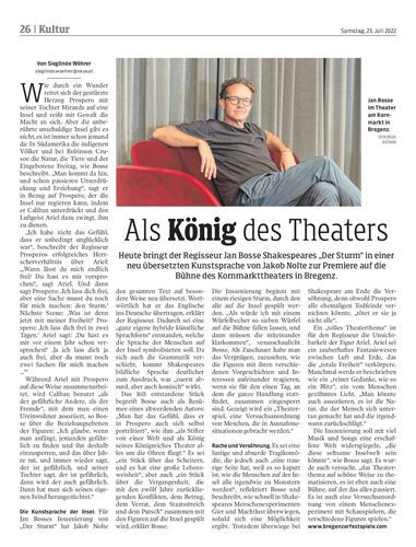Heute bringt der Regisseur Jan Bosse Shakespeares „Der Sturm“ in einer neu übersetzten Kunstsprache von Jakob Nolte zur Premiere auf die Bühne des Kornmarkttheaters in Bregenz.