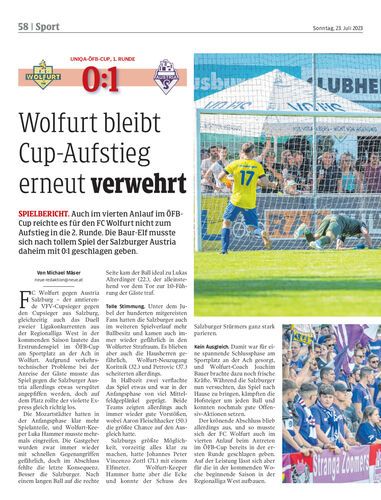 Spielbericht. Auch im vierten Anlauf im ÖFB-Cup reichte es für den FC Wolfurt nicht zum Aufstieg in die 2. Runde. Die Baur-Elf musste sich nach tollem Spiel der Salzburger Austria daheim mit 0:1 geschlagen geben.