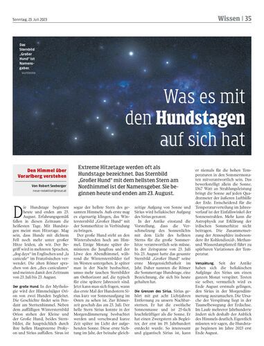 Extreme Hitzetage werden oft als Hundstage bezeichnet. Das Sternbild „Großer Hund“ mit dem hellsten Stern am Nordhimmel ist der Namensgeber. Sie beginnen heute und enden am 23. August.