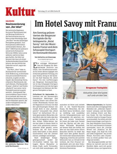 Am Sonntag präsentierten die Bregenzer Festspiele die Hybridoperette „Hotel Savoy“ mit der Musicbanda Franui und dem Schauspiel Stuttgart im Kornmarkttheater.