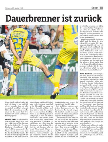 Andreas Lienhart ist fit für das Spiel am Donnerstag gegen Maccabi Tel Aviv. Eine Aufgabe wird es sein, Sturmtank Hannes Aigner mit Bällen von der Seite zu füttern. Eine taktische Variante, die im Hinspiel noch gefehlt hatte.