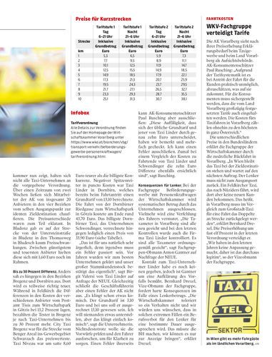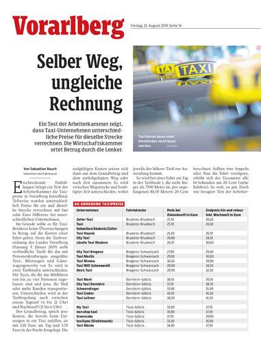 Preisunterschiede. Test der Arbeiterkammer zeigt, dass Taxi-Unternehmen in Vorarlberg unterschiedliche Preise für dieselbe Strecke verrechnen. Die Fachgruppe der Wirtschaftskammer ortet Betrug durch die Lenker. Seiten 14/15 Hartinger