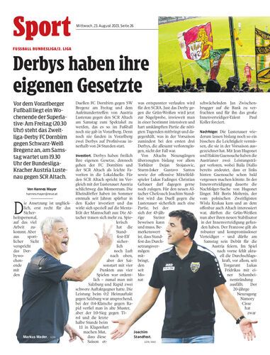 Vor dem Vorarlberger Fußball liegt ein Wochenende der Superlative: Am Freitag (20.30 Uhr) steht das Zweitliga-Derby FC Dornbirn gegen Schwarz-Weiß Bregenz an, am Samstag wartet um 19.30 Uhr der Bundesliga-Kracher Austria Lustenau gegen SCR Altach.