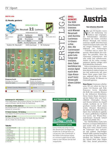 Spielbericht. Vor 1020 Zuschauern trennen sich Wiener Neustadt und Austria Lustenau 1:1-Unentschieden. Die Lustenauer zeigen eine gute Leistung und trotzem dem Tabellenführer im ersten Spiel nach dem Lipa-Rauswurf trotz Unterzahl einen Zähler ab.