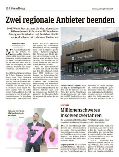 Die E-Werke Frastanz und die Montafonerbahn AG beenden mit 31. Dezember 2025 die Belieferung von Haushalten und Betrieben. Die Illwerke vkw bieten sich als neuer Partner an.