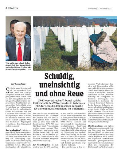 UN-Kriegsverbrecher-Tribunal spricht Ratko Mladić des Völkermordes in Srebrenica 1995 für schuldig. Der bosnisch-serbische Ex-General muss lebenslang ins Gefängnis.