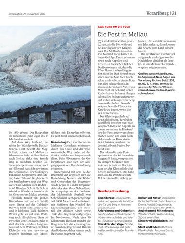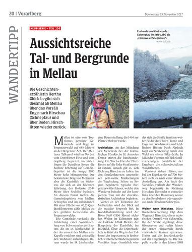 Die Geschichtenerzählerin Hertha Glück begibt sich diesmal ab Mellau über das Vorsäß Enge nach Hirschau (Schnepfau) und über Boden, Hirschlitten wieder zurück.