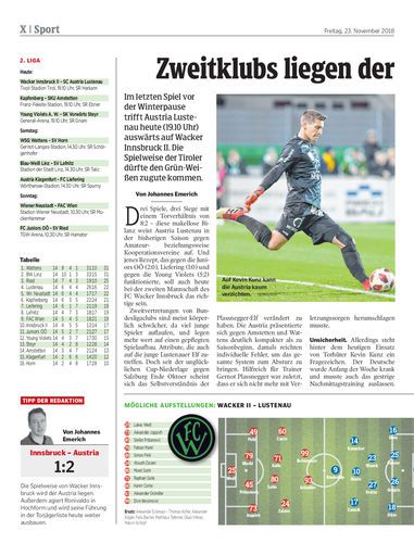 Im letzten Spiel vor der Winterpause trifft Austria Lustenau heute (19.10 Uhr) auswärts auf Wacker Innsbruck II. Die Spielweise der Tiroler dürfte den Grün-Weißen zugute kommen.