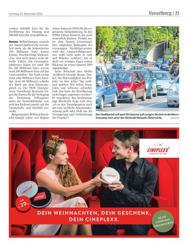 Im Februar wird die Verhandlung zur Umweltverträglichkeit des Feldkircher Stadttunnels fortgesetzt. Land rechnet mit positivem Ausgang.