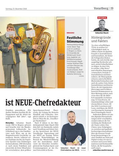 Der bisherige Sportchef Sebastian Rauch ist neuer Chefredakteur der NEUE Vorarlberger Tageszeitung und NEUE am Sonntag.