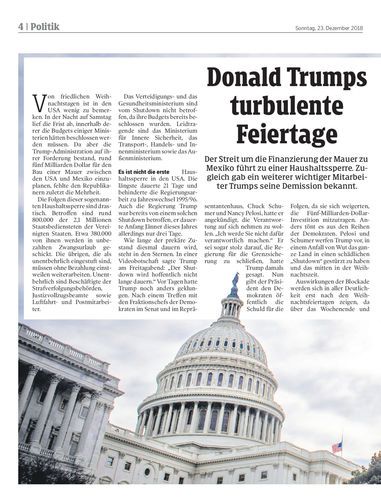 Der Streit um die Finanzierung der Mauer zu Mexiko führt zu einer Haushaltssperre. Zugleich gab ein weiterer wichtiger Mitarbeiter Trumps seine Demission bekannt.
