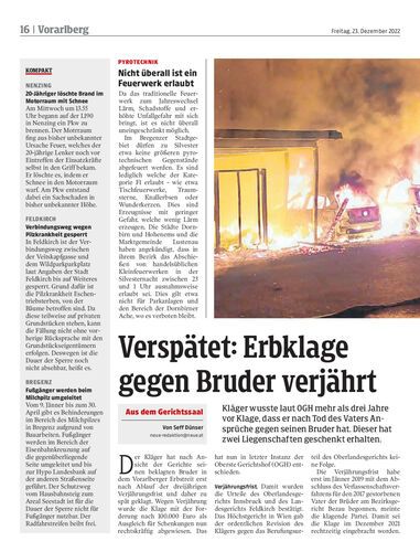 Kläger wusste laut OGH mehr als drei Jahre vor Klage, dass er nach Tod des Vaters Ansprüche gegen seinen Bruder hat. Dieser hat zwei Liegenschaften geschenkt erhalten.
