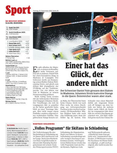 Der Schweizer Daniel Yule gewann den Slalom in Madonna. Johannes Strolz kam eine Stange in die Quere. Österreicher waren aber stark.