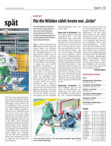 Um im Kampf um die Play-off-Tickets weiter dabei zu sein muss der EC Bregenzerwald heute (19.30 Uhr) im Messestadion gegen den amtierenden Meister Ritten einen Sieg einfahren.
