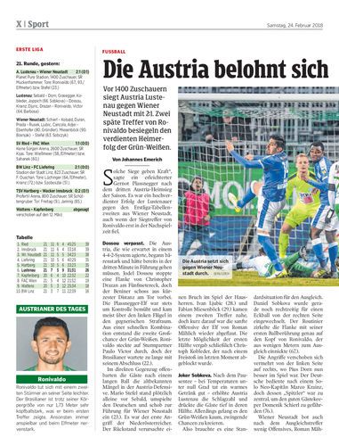 Vor 1400 Zuschauern siegt Austria Lustenau gegen Wiener Neustadt mit 2:1. Zwei späte Treffer von Ronivaldo besiegeln den verdienten Heimerfolg der Grün-Weißen.
