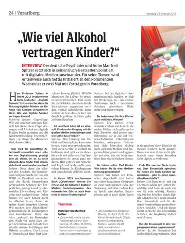 Interview. Der deutsche Psychiater und Autor Manfred Spitzer setzt sich in seinen Buch-Bestsellern pointiert mit digitalen Medien auseinander. Für seine Thesen wird er teilweise auch heftig kritisiert. In den kommenden Wochen ist er zwei Mal mit Vorträgen in Vorarlberg.