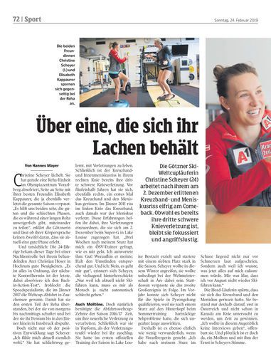 Die Götzner Ski-Weltcupläuferin Christine Scheyer (24) arbeitet nach ihrem am 2. Dezember erlittenen Kreuzband- und Meniskusriss eifrig am Comeback. Obwohl es bereits ihre dritte schwere Knieverletzung ist, bleibt sie fokussiert und angriffslustig.