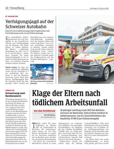 18-jähriger Lehrling starb 2017 bei Brückeneinsturz im Montafon. Seine Eltern fordern in Arbeitsprozess von Ex-Geschäftsführer der Baufirma 37.100 Euro Schmerzengeld.