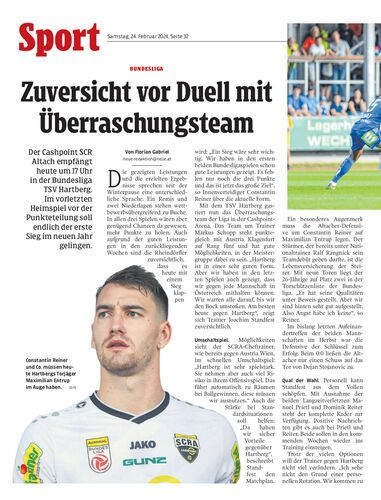 Der Cashpoint SCR Altach empfängt heute um 17 Uhr in der Bundesliga TSV Hartberg. Im vorletzten Heimspiel vor der Punkteteilung soll endlich der erste Sieg im neuen Jahr gelingen.