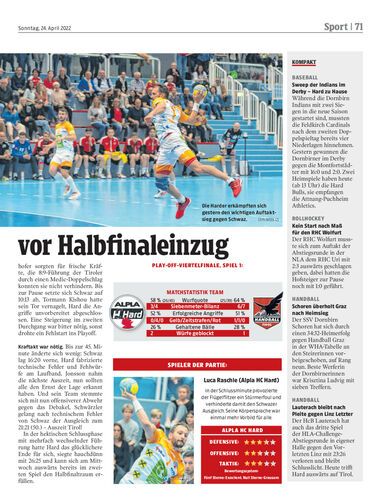 Alpla HC Hard gewinnt Spiel eins der Viertelfinal-Serie gegen Schwaz 26:25 und kann am Mittwoch in Tirol den frühzeitigen Einzug ins Halbfinale fixieren.