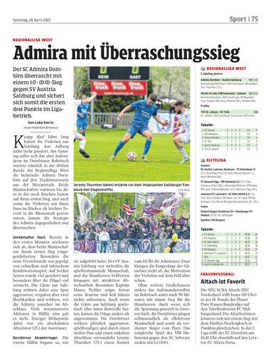 Der SC Admira Dornbirn überrascht mit einem 1:0- (0:0)-Sieg gegen SV Austria Salzburg und sichert sich somit die ersten drei Punkte im Ligabetrieb.
