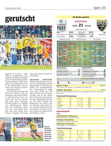 Spielbericht. Altach verliert beim LASK Abwehrrecke Mickael Nanizayamo (37.) durch Rot und unterliegt trotz starker Gegenwehr mit 1:2. Da der SCRA erstmals in der Qualigruppe nicht punktet, ist man wieder Schlusslicht.