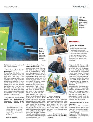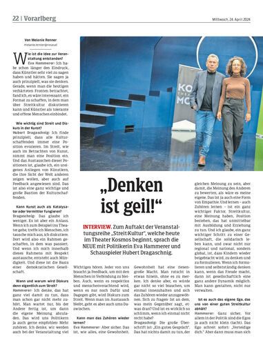 Interview. Zum Auftakt der Veranstaltungsreihe „Streit:Kultur“, welche heute im Theater Kosmos beginnt, sprach die NEUE mit Politikerin Eva Hammerer und Schauspieler Hubert Dragaschnig.