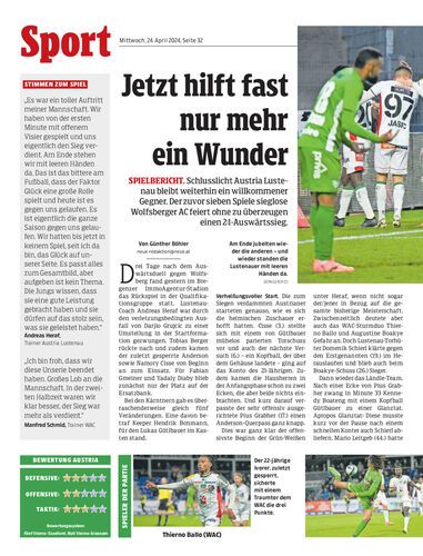 Spielbericht. Schlusslicht Austria Lustenau bleibt weiterhin ein willkommener Gegner. Der zuvor sieben Spiele sieglose Wolfsberger AC feiert ohne zu überzeugen einen 2:1-Auswärtssieg.