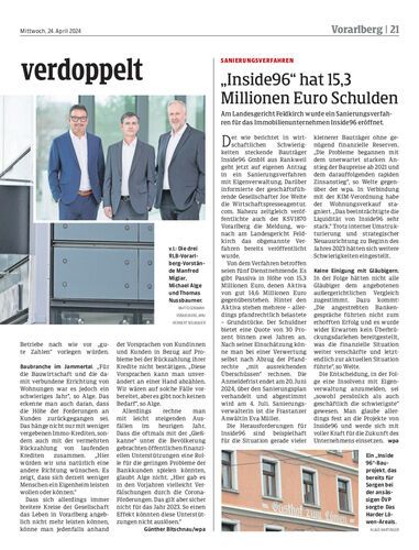 Am Landesgericht Feldkirch wurde ein Sanierungsverfahren für das Immobilienunternehmen Inside96 eröffnet.