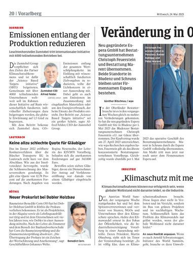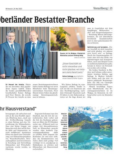 Neu gegründete Espera GmbH hat Bestattungsunternehmen Christoph Feuerstein und Bestattung Marent übernommen. Beide Standorte in Bludenz und Schruns bleiben unter Firmennamen Espera bestehen.